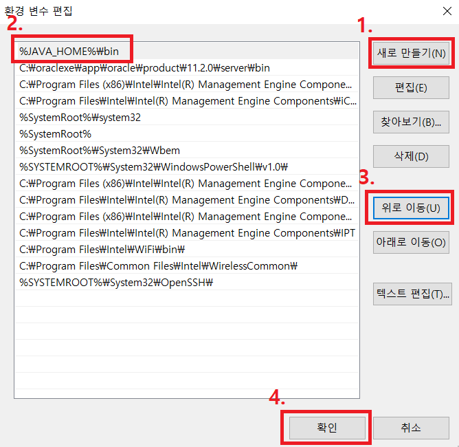 그 후 새로 만들기를 클릭하신 후 "%JAVA_HOME%\bin"을 추가시킨 후 제일 위로 이동시킵니다. "%JAVA_HOME%"는 JAVA_HOME 환경 변수의 값을 참조한다는 뜻입니다. %JAVA_HOME% 대신에 JDK가 설치된 전체 경로를 직접 넣으셔도 상관없습니다. 추가를 하셨다면 확인 버튼을 클릭합니다.