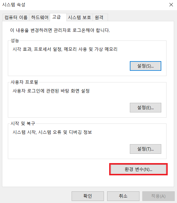 시스템 속성에 들어오셨으면 환경변수를 클릭합니다.