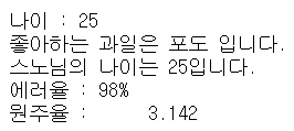 print("원주율 : %10.3f" %point)
