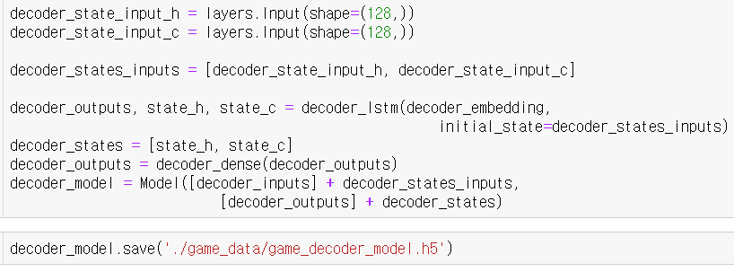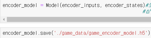 모델 객체를 생성하여 입력데이터로써 레이어를 받은 상태에서 LSTM을 통해 얻은 hiddlen Layer와 Cell Layer를 받습니다. 그 후, 모델을 저장합니다.