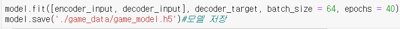 IN(Padding된 질문, 답변) target( 학습된 target 값) 학습을 한 후, 모델을 저장합니다.