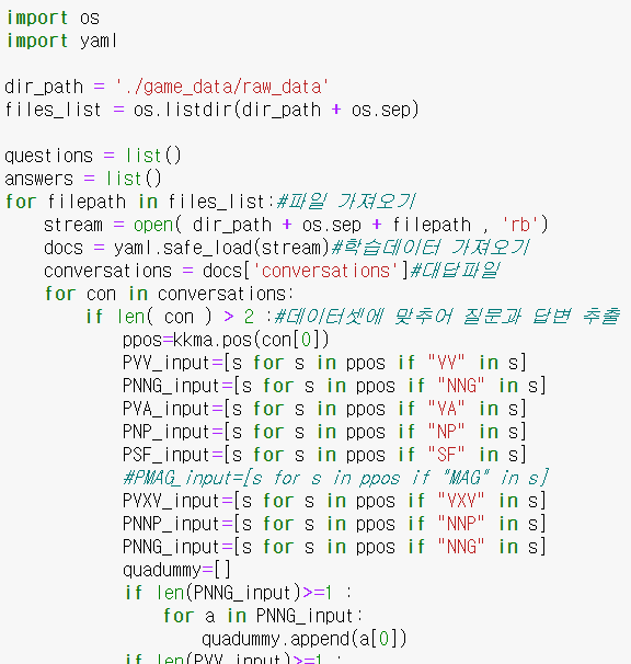 그 후, raw_data에서 파일을 가져와 데이터셋에 맞추어 질문과 답변을 추출합니다.