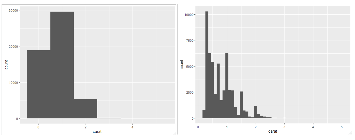 양적자료인 carat은 막대그래프가 아닌 히스토그램을 사용하시면 됩니다.