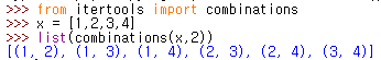 list(combinations(x,2)) // 리스트의 값들을 2개씩 묶은 모든 조합 구하기