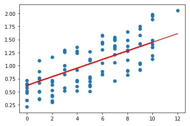 찍힌 점들은 실제 데이터 점이며, 그어진 직선이 단순선형회귀를 통해 구해진 모델입니다.