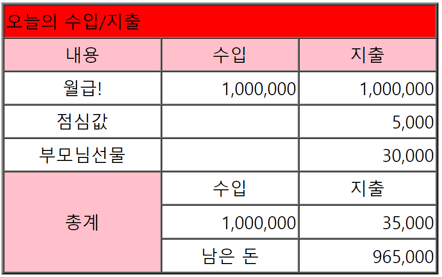 <td Colspan="3" bgcolor="Red">오늘의 수입/지출</td>